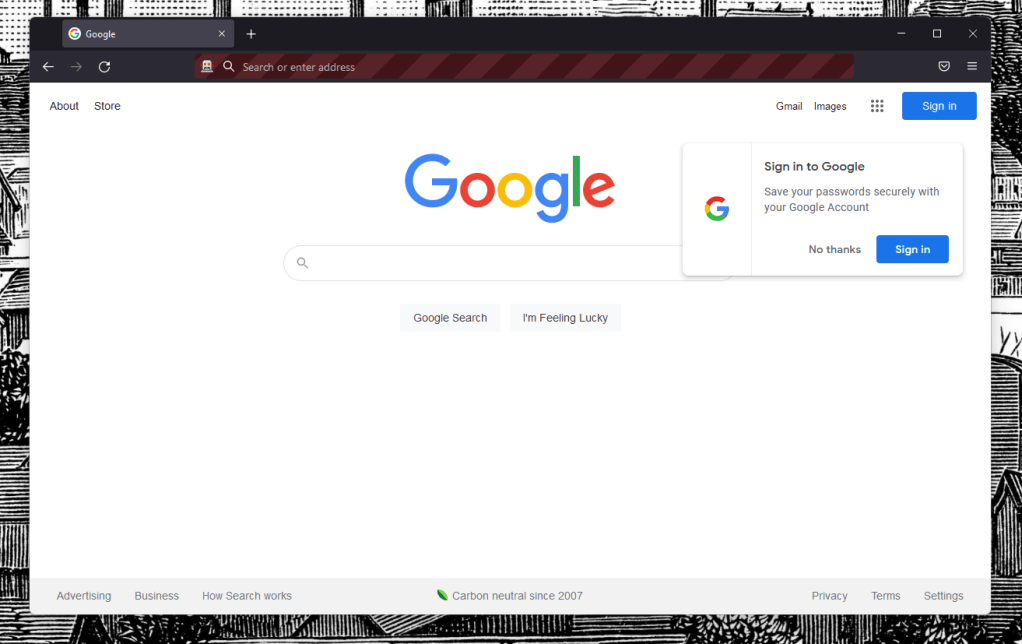 Great! we now have a spooky looking, empty, Firefox session, with a favicon of a little robot in the URL address bar!