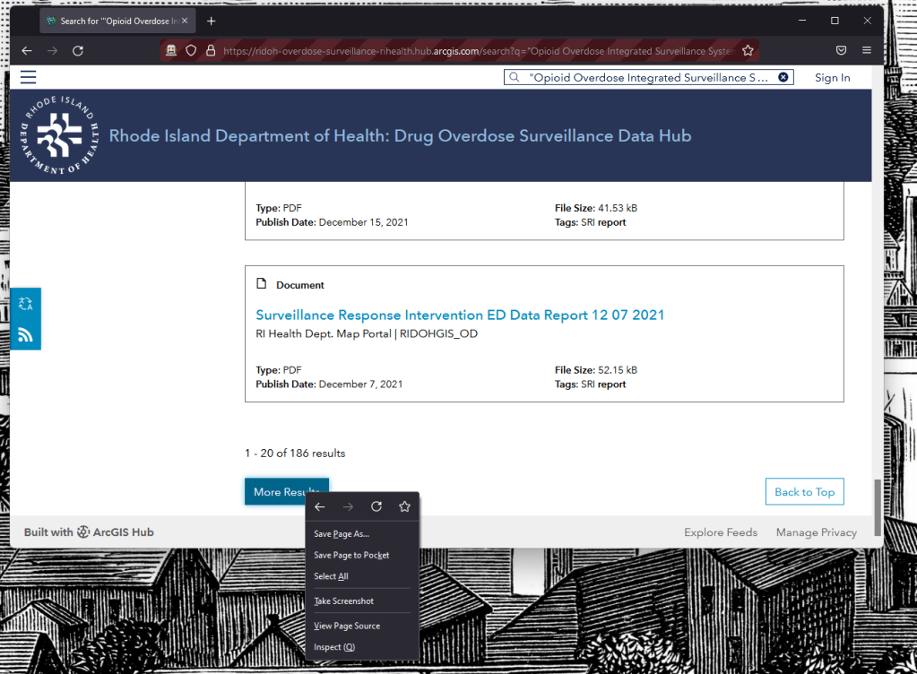I started to look around to see if the data was publicly available. RIDOH has a “Drug Overdose Surveillance Data Hub” which they say “provides several sources of non-fatal and fatal overdose data with a special focus on municipal, county, and statewide trends.” The website can be found here: https://ridoh-overdose-surveillance-rihealth.hub.arcgis.com/