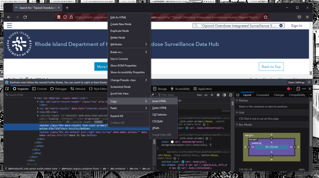By clicking inspect, the browser you are using (in my case Firefox) devtools should also popup. Now the following may not totally replicate in other web browsers, so ymmv. In the case of Firefox, it will highlight the the particular element you inspected – here it’s highlighting “<button class=”btn more-results link-primary” …>”.