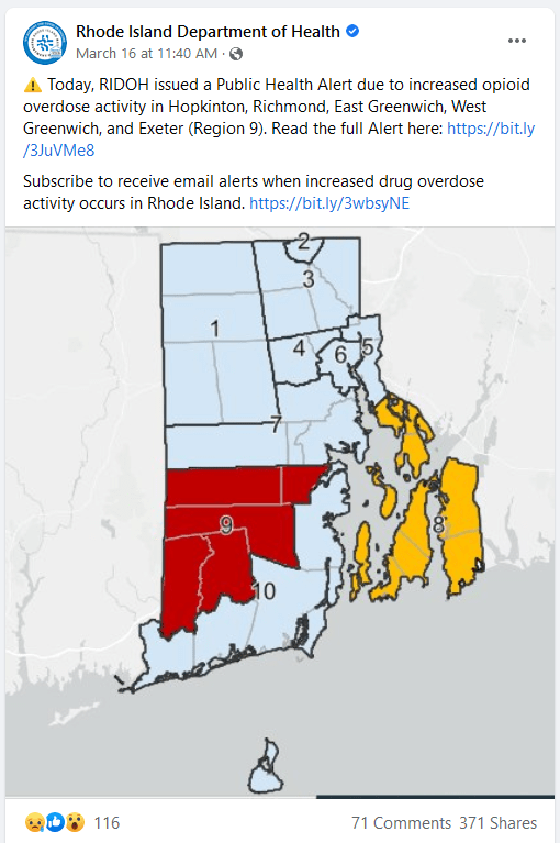 The other day I came across a Rhode Island Department of Health (RIDOH) social media post regarding a Public Health Alert for increased opioid overdose activity in a particular area of Rhode Island. See the particular post & heatmap below.